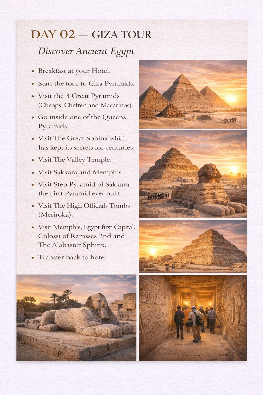- Explore the Great Pyramids of Giza, the Sphinx, and the Valley Temple
