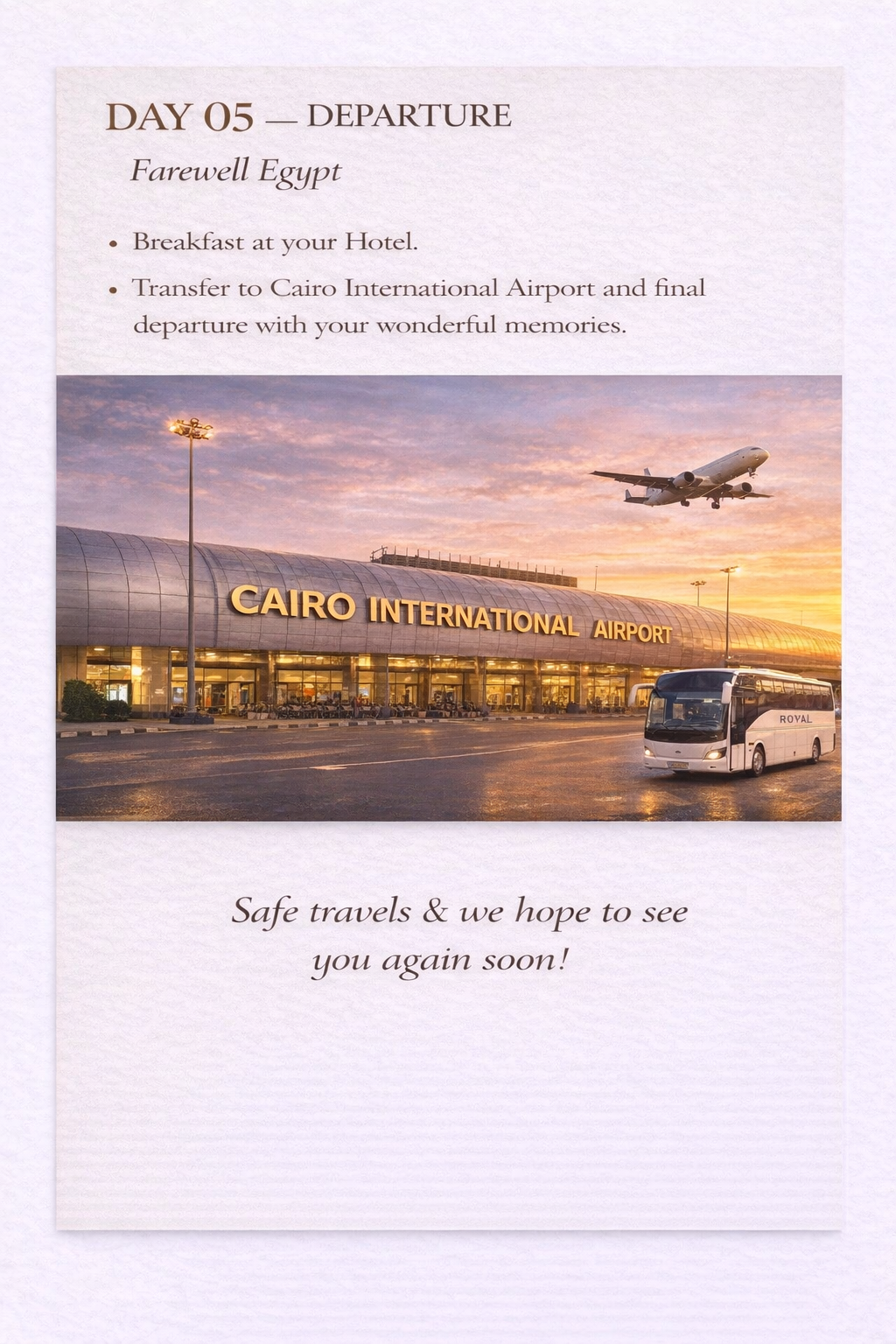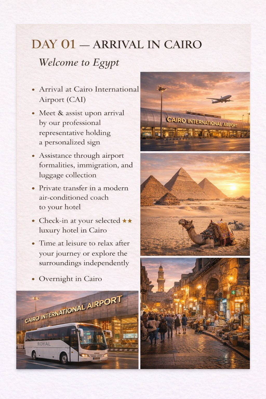 Ideal for first-time visitors, cultural enthusiasts, and history-focused travel programs, this itinerary offers a comprehensive overview of Egypt’s most iconic sites in a short, well-balanced timeframe.