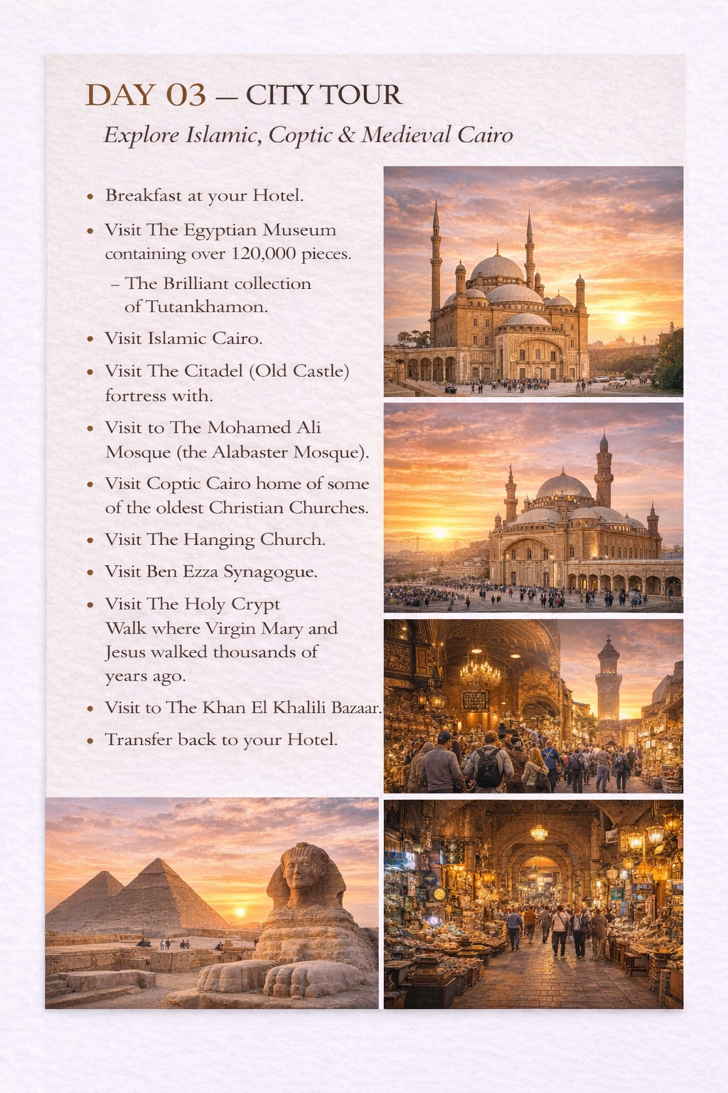 - Experience Islamic Cairo, including the Citadel and Mohamed Ali Mosque