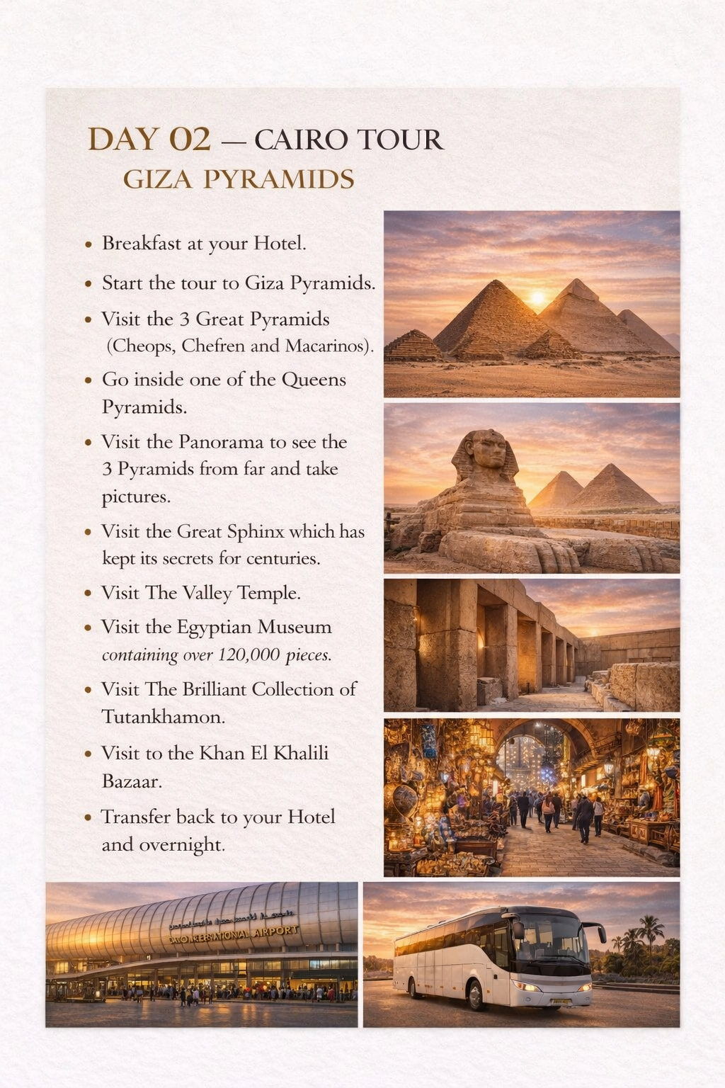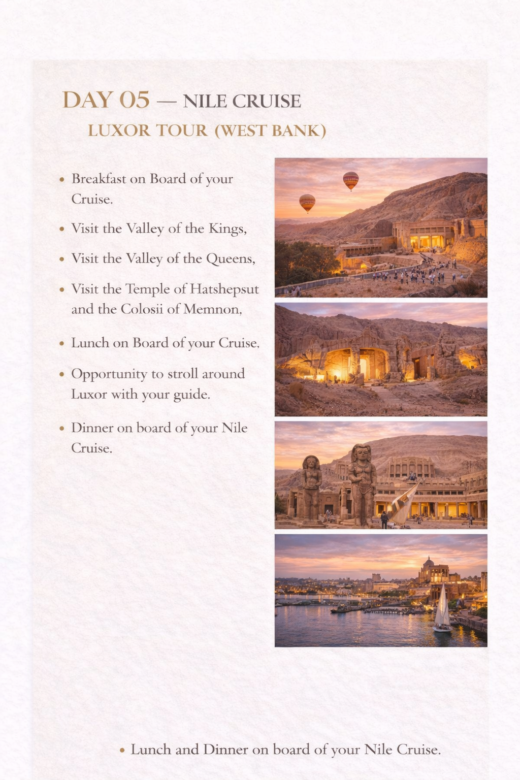 Dalle Grandi Piramidi e i tesori di Tutankhamon alla navigazione sul Nilo tra fertili paesaggi e magnifici templi, questo tour offre un perfetto equilibrio tra visite guidate, relax e autentiche esperienze egiziane.