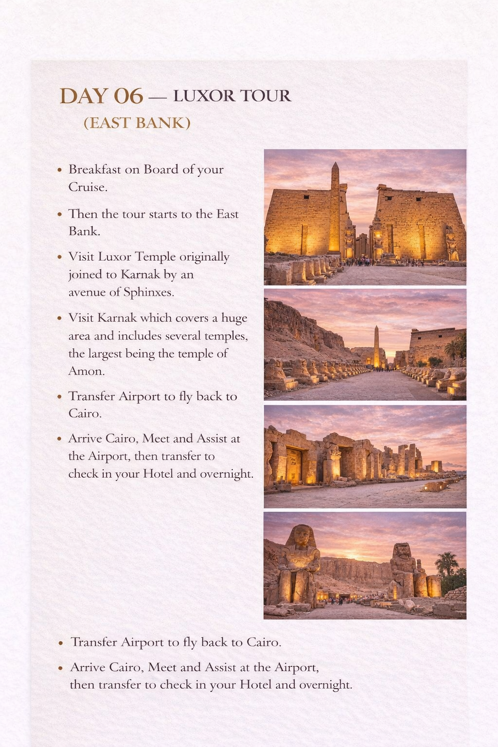 Scopri le meraviglie senza tempo dell'Egitto in questo viaggio indimenticabile che unisce storia antica, cultura vibrante e una lussuosa crociera sul Nilo. Questo itinerario accuratamente studiato ti porterà dai monumenti iconici del Cairo alla tranquilla bellezza di Assuan e ai leggendari templi di Luxor.
