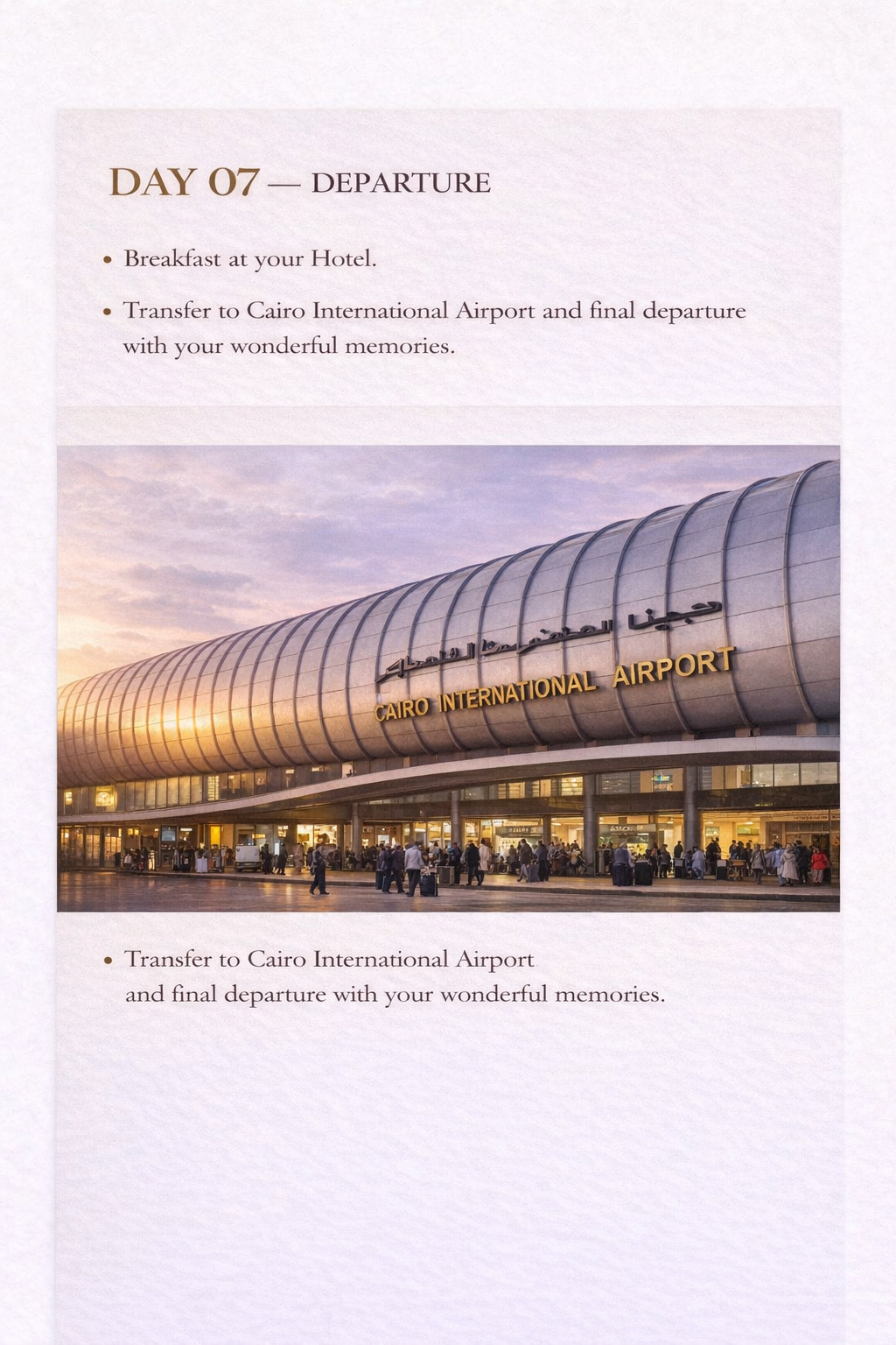 - Voli nazionali (Cairo–Assuan / Luxor–Cairo) tasse incluse