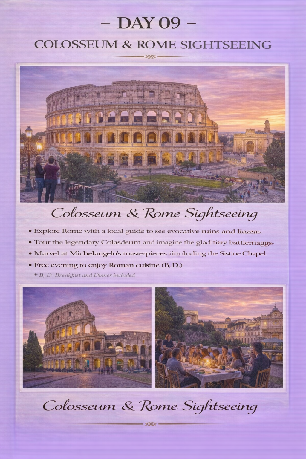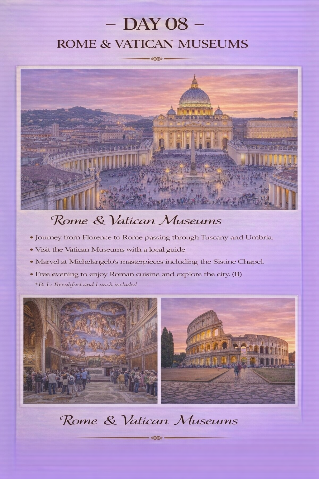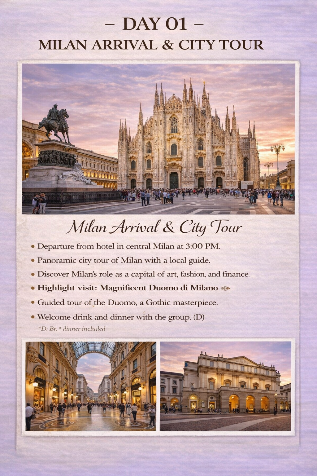 - Welcome dinner in Milan & farewell dinner in Rome
