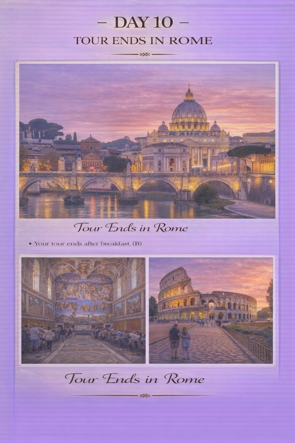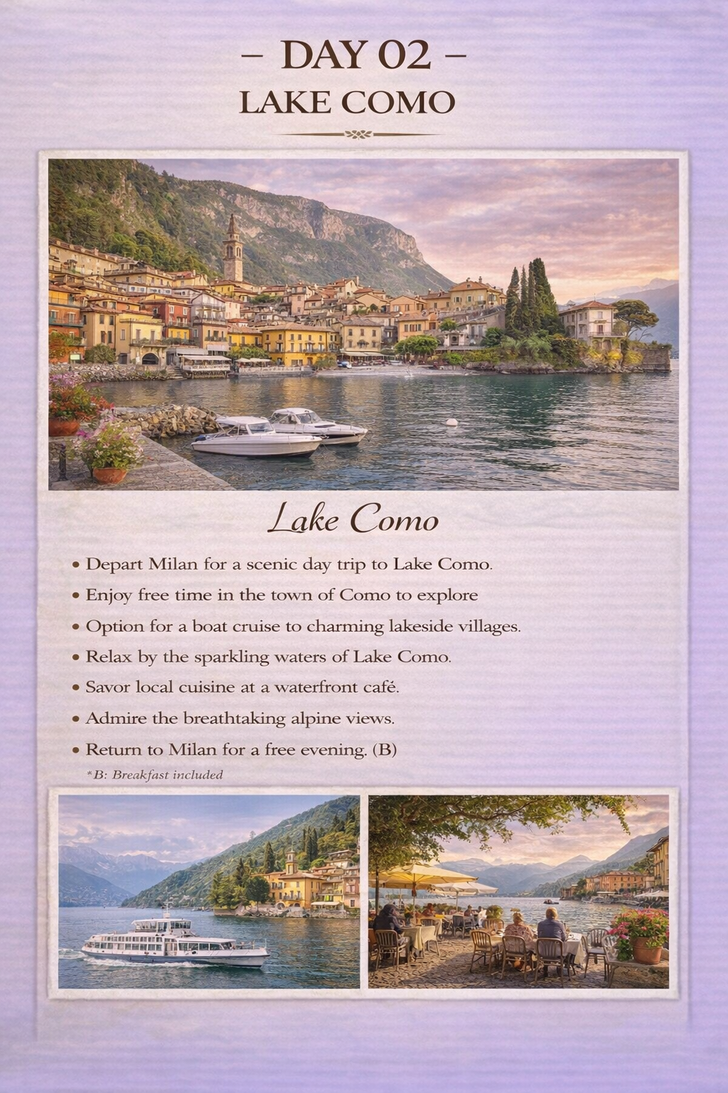 Experience the very best of Italy on this immersive 9-night, 10-day guided journey through the country’s most iconic cities and landscapes. From the fashion capital of Milan and the tranquil beauty of Lake Como and Lake Garda, to the romantic canals of Venice, the Renaissance treasures of Florence, and the ancient wonders of Rome, this itinerary blends history, art, cuisine, and scenery into one unforgettable adventure.