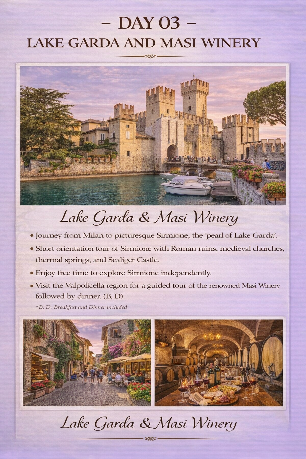 - Visit to Sirmione on Lake Garda, known as the “Pearl of the Lake”