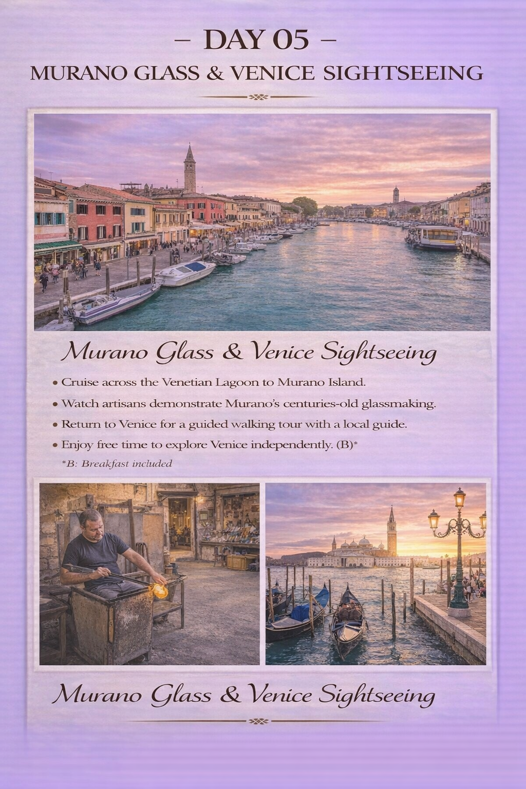 - Venice sightseeing including Murano glassmaking demonstration