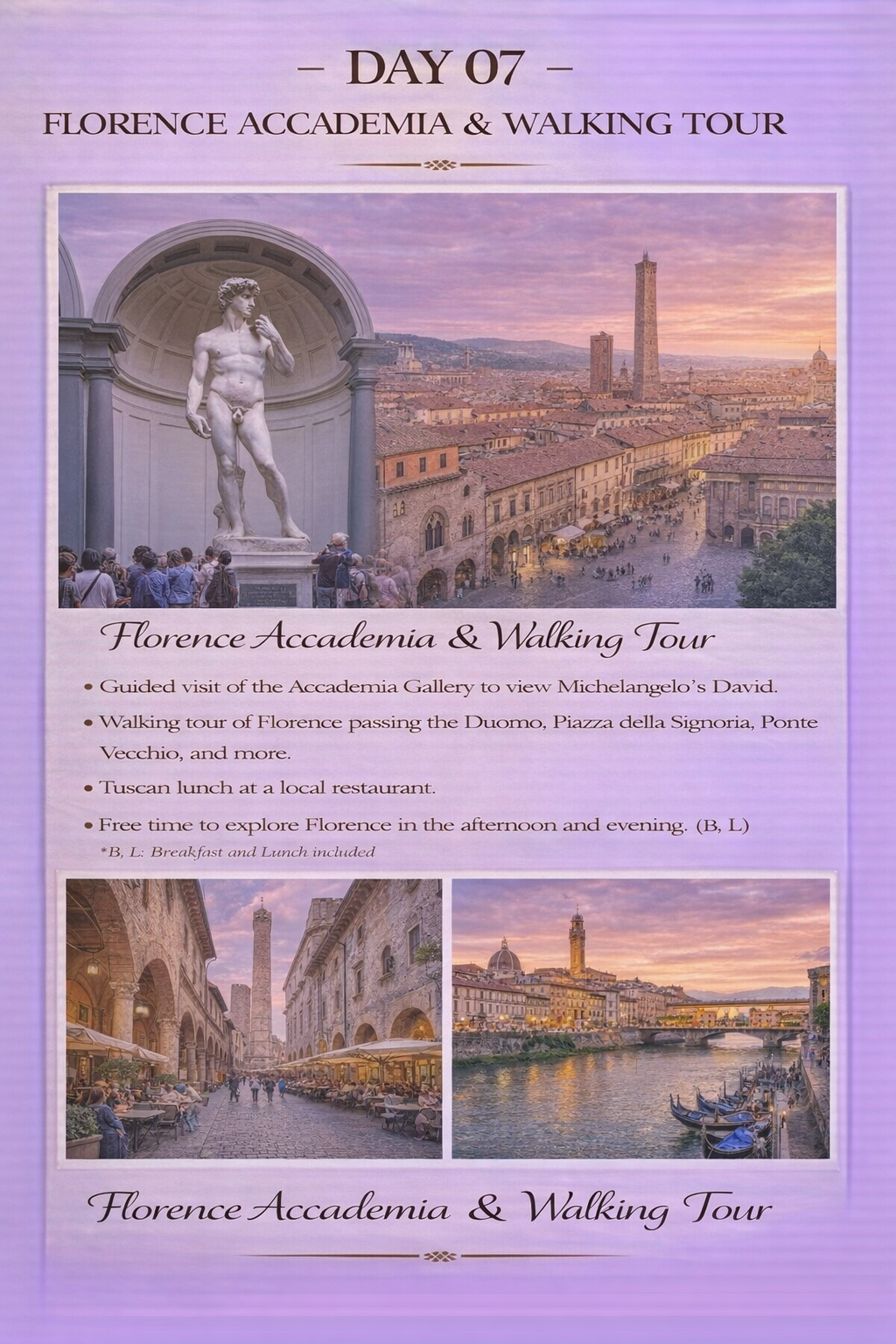- Guided visit to Florence’s Accademia Gallery to see Michelangelo’s David