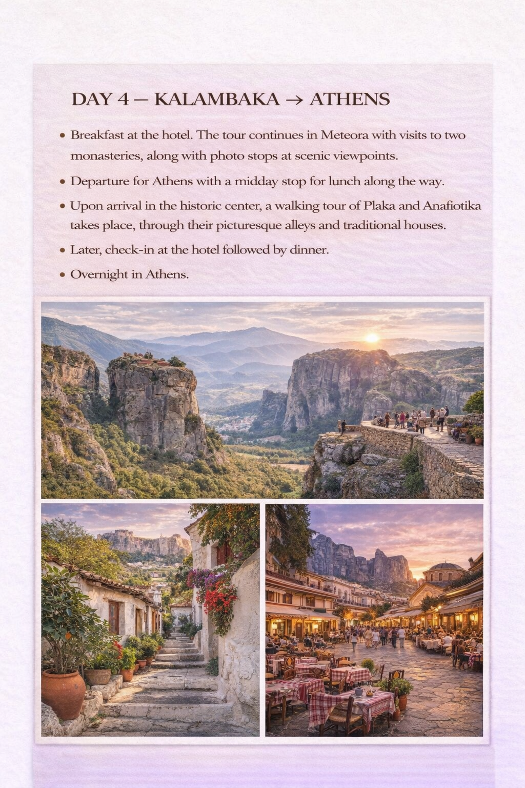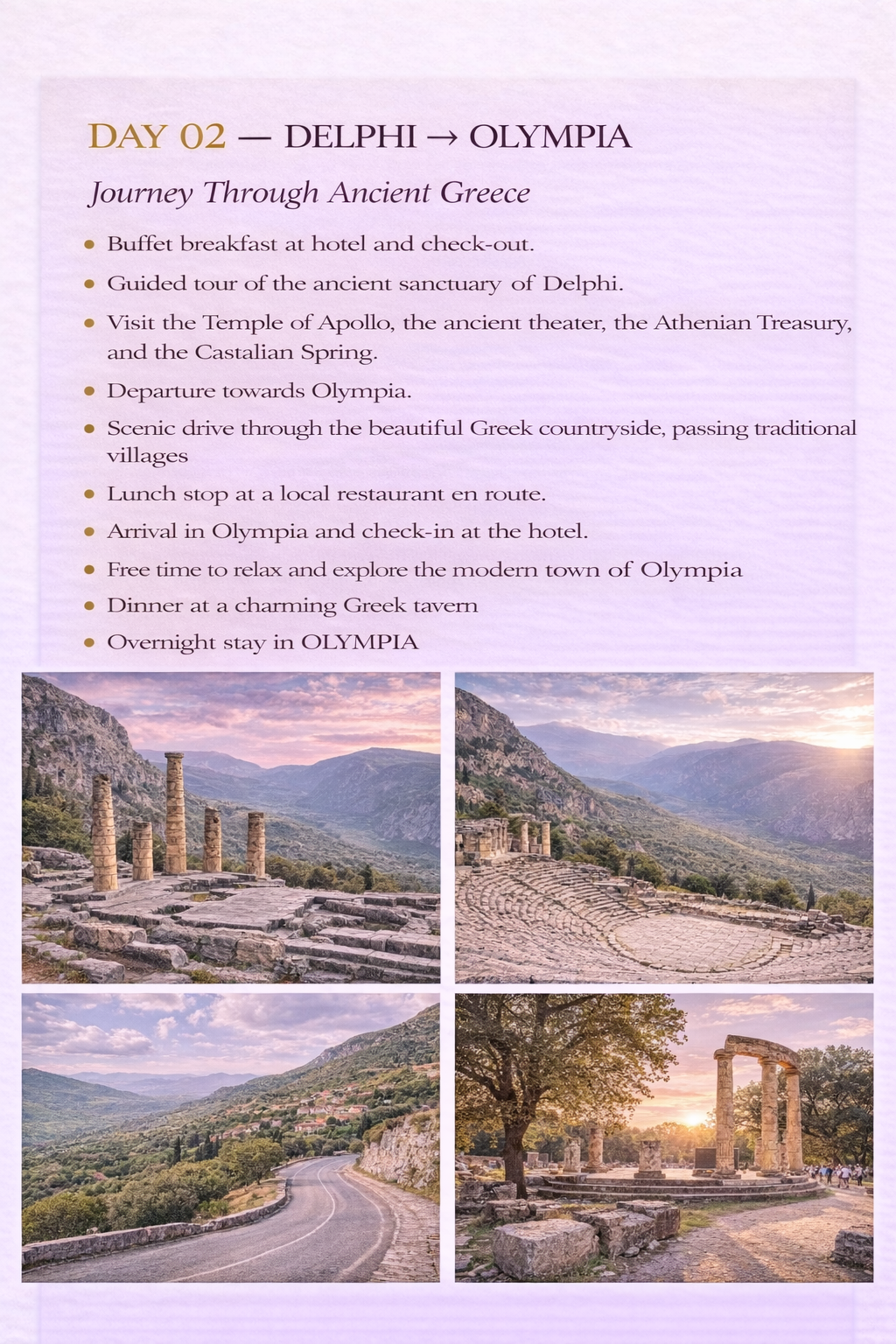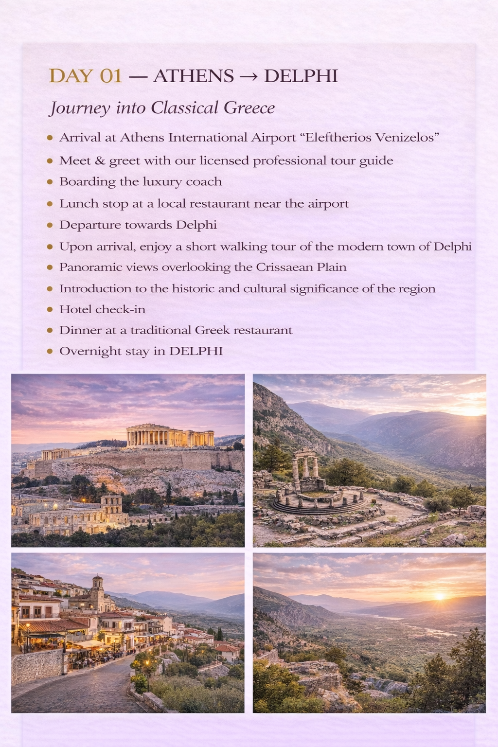 Bu 9 günlük rehberli Yunanistan turu, ülkenin en ikonik klasik, arkeolojik ve ada destinasyonlarının kapsamlı bir keşfini sunuyor. Atina'da başlayan program, Delphi, Olympia, Kalambaka (Meteora) üzerinden geçerek Atina'ya geri dönüyor ve ardından Kiklad adaları Mykonos ve Santorini'ye devam ediyor.