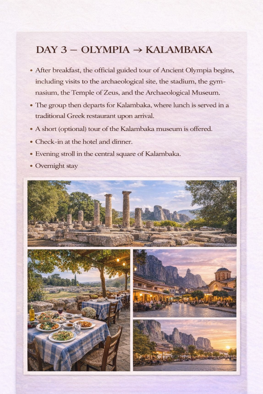 Rota: Atina → Delphi → Olympia → Kalambaka → Atina → Mikonos → Delos → Santorini → Atina