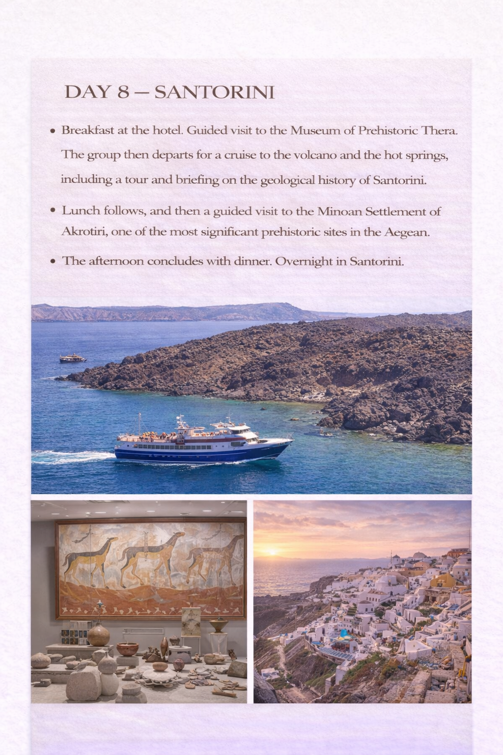 Konuklar, antik miras alanlarını, UNESCO Dünya Mirası listesindeki yerleri, doğal güzellikleri, kültürel yürüyüş turlarını, ada gezilerini ve otantik Yunan mutfağını bir araya getiren özenle dengelenmiş bir seyahat programı deneyimlerler. Yolculuk, uluslararası seyahat için Santorini'den Atina'ya dönüş uçuşuyla sona erer.