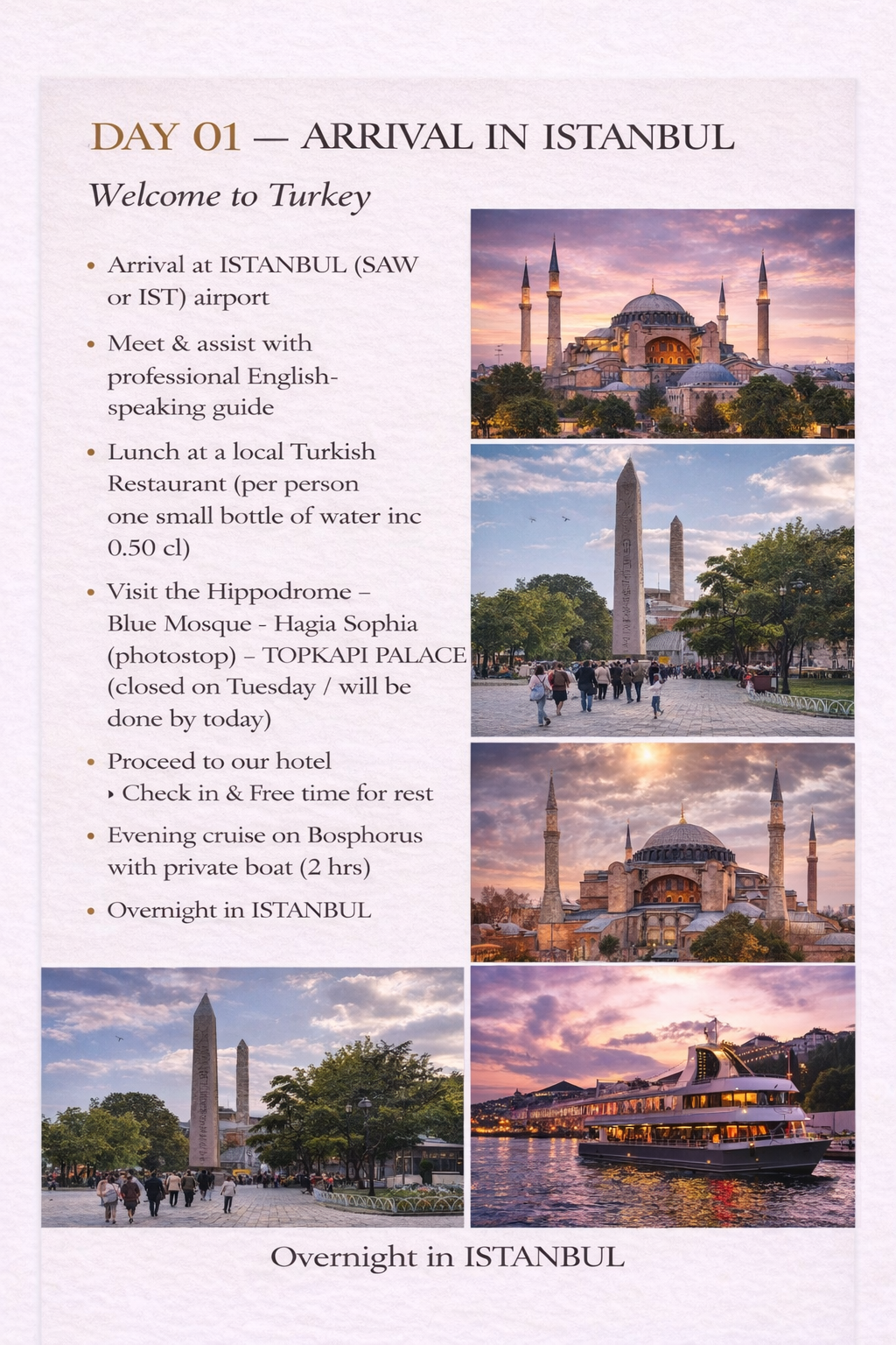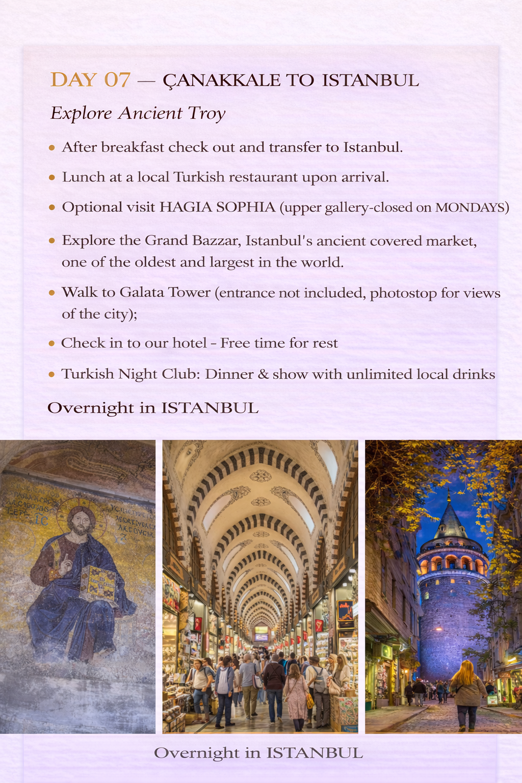 - Last-day Istanbul sightseeing as per itinerary