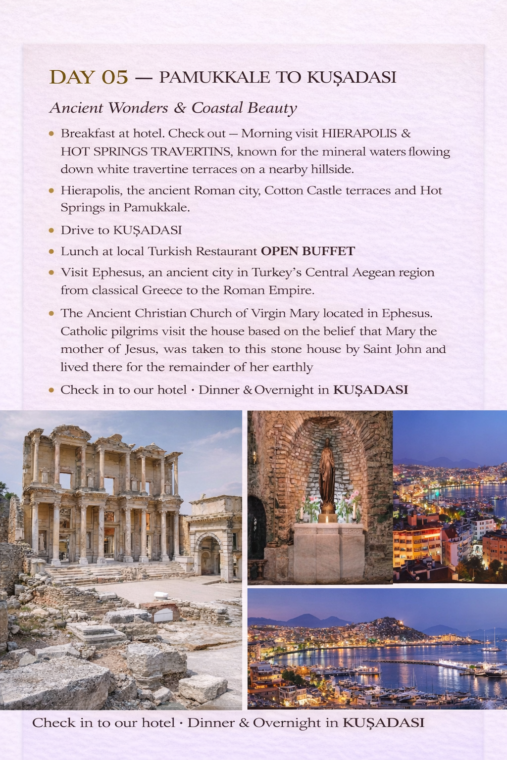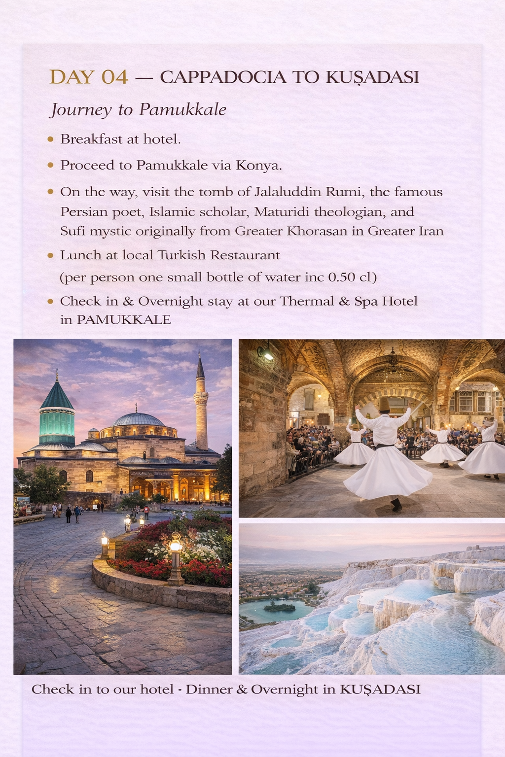 The program combines Byzantine, Roman, Ottoman, and early Christian heritage with Turkey’s most iconic landscapes, including Istanbul, Cappadocia, Pamukkale, Kuşadası, Çanakkale, and historic Konya. Guests experience a balanced pace of guided sightseeing, cultural immersion, scenic drives, and premium accommodations, supported by seamless logistics and expert English-speaking guides throughout.